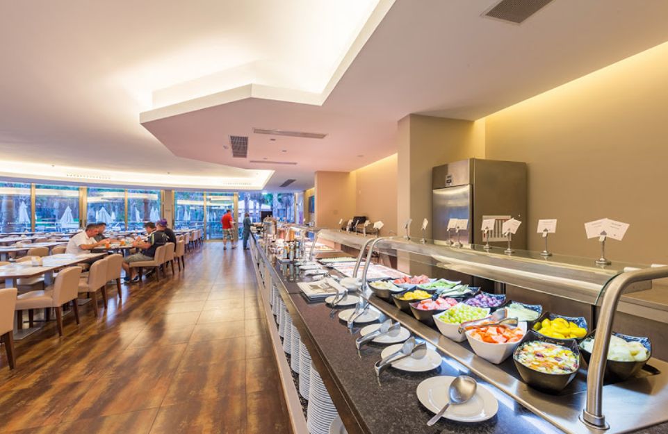 Tiene tres restaurantes y dos bares para todo tipo de comidas y bebidas, diez piscinas (cuatro de ellas para los más pequeños), amplios jardines, un kids club con 230 metros cuadrados, mini golf para los niños, un gimnasio al aire libre, un campo de voleibol, tres de ténis, uno de futbol y un espacio con césped para jugar a la petanca.