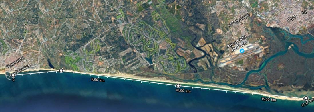 Esto quiere decir que si empezamos a andar por la arena en Villamoura-Quarteira podemos llegar a la desembocadura del río Formosa sin hacer ninguna salida de la playa. Este arenal empieza en la desembocadura del río Quarteira y llega con diferentes nombres hasta el final de la playa de la isla desierta en mitad del parque natural de la ria de Formosa recorriendo muchisimas playas de gran calidad. Por orden de este a oeste, encontramos las siguientes playas : Playa de Quarteira, Playa da Gaviota , Playa do Forte Novo, Playa do Almagrem, Playa do Lagoa, Playa do Loulé Velho, Playa do Trafal, Playa de Vale do Lobo, Playa do Dunas douradas, Playa do Garrão, Playa do Anção , Playa Quinta do Lago, Playa de Faro Mar, Playa de Faro Este, Playa da Barrinha, Playa da Barreta y por ultimo la bella Playa de la Isla Desierta a la que hay que llegar en barco desde Faro.