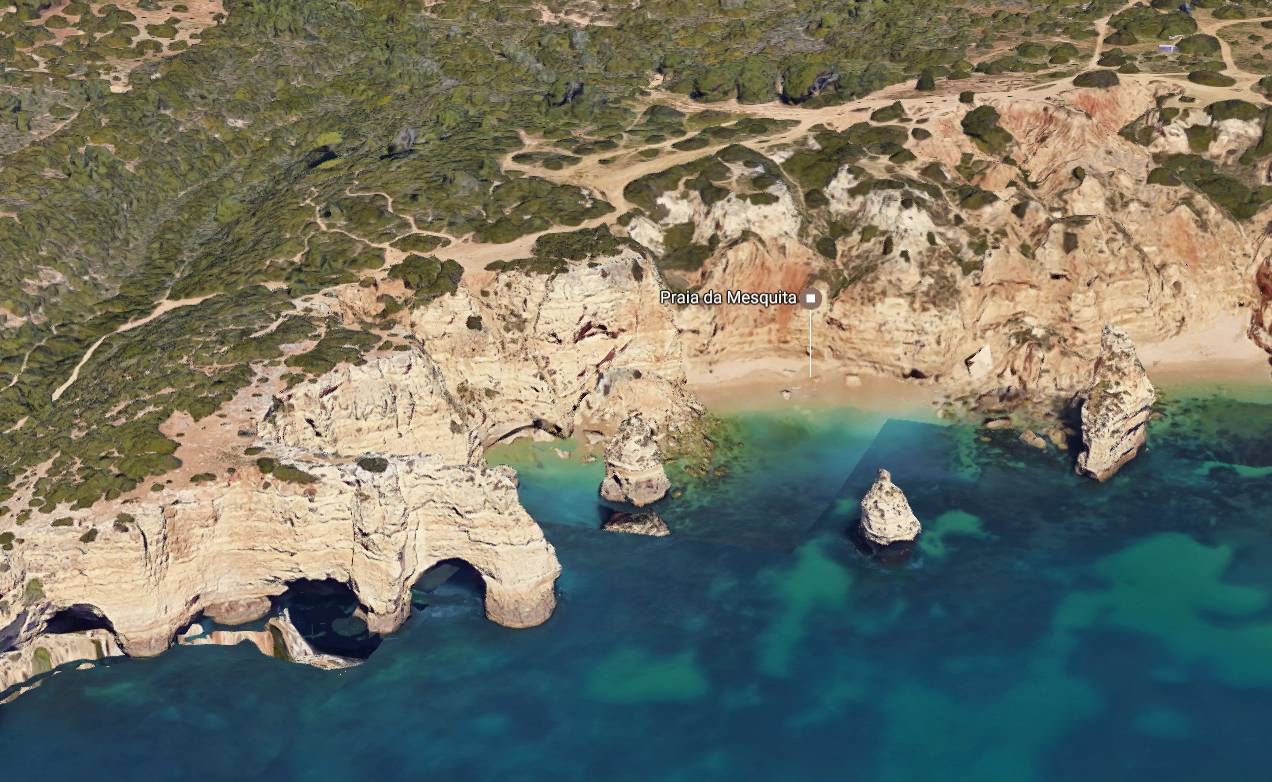 Playa da Mesquita es una playa algarvense que está cerca del pueblo de Benagil. El Algarve en general tiene playas en espacios naturales muy virgenes que bien por su lejania a los destinos convencionales o por su dificil acceso hay poca accion humana y son lugares muy intimos y tranquilos y generalmente si hay es un pequeño bar, pero no hay duchas ni otros servicios, Playa da Mesquita es una de esas playas Virgenes que os encatará. El acceso a la playa no es sencillo y deberemos dejar el coche bastante alejado y darnos un buen paseo para llegar al mar. La ventaja de esto es que nos vamos a encontrar una playa muy tranquila casi sin nadie que nos moleste. La playa es bastante estrecha por lo que cuando sube la marea puede incluso llegar a desaparecer bajo las olas. Un elemento que nos encatará de esta playa, son los acantilados naturales que rodean la playa y que dan una gran sensacion de intimidad. En estos acantilados en las épocas frías del año, se refugian multiples aves marinas. Playa da Mesquita es una playa bastante pequeña, casi una cala por lo que en verano puede estar bastante saturada. Playa da Mesquita como la mayoría de las playas del algarve, es de arena pero tiene algunas partes en las que tiene rocas, si nos bañamos cerca de ellas debemos tener cuidado pues podria haber erizos de mar que si los tocamos sin querer nos podemos pinchar o podriamos chocar con ellas si hay corrientes o oleaje. Frente a Playa da Mesquita, encotramos algunas rocas que sobresalen del mar y que dan un precioso contraste al color turquesa del mar algarvense. x