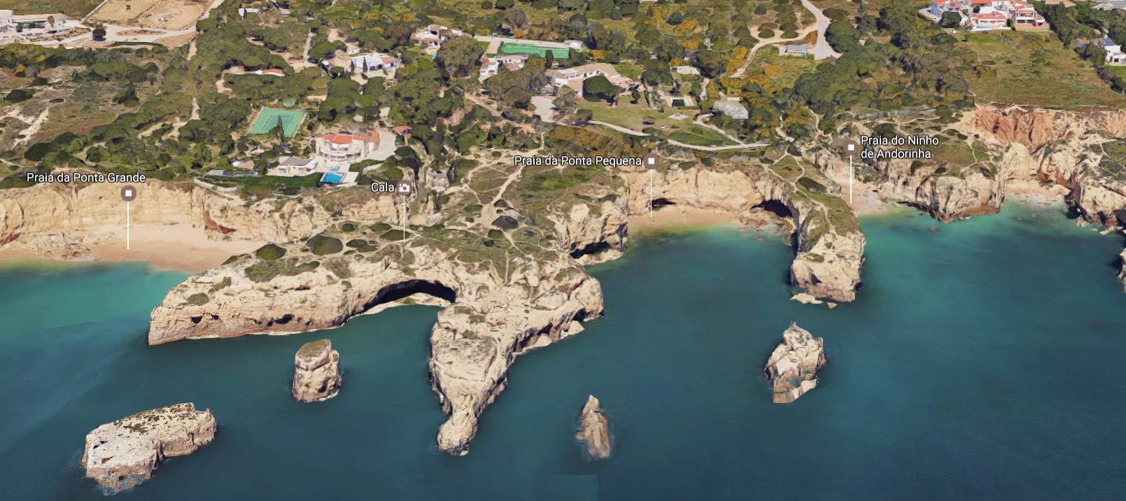 Playa da ponta grande es una playa algarvense que está cerca del pueblo de Galé. Un elemento que nos encatará de esta playa, son los acantilados naturales que rodean la playa y que dan una gran sensacion de intimidad. En estos acantilados en las épocas frías del año, se refugian multiples aves marinas. El Algarve en general tiene playas en espacios naturales muy virgenes que bien por su lejania a los destinos convencionales o por su dificil acceso hay poca accion humana y son lugares muy intimos y tranquilos y generalmente si hay es un pequeño bar, pero no hay duchas ni otros servicios, Playa da ponta grande es una de esas playas Virgenes que os encatará. El acceso a la playa no es sencillo y deberemos dejar el coche bastante alejado y darnos un buen paseo para llegar al mar. La ventaja de esto es que nos vamos a encontrar una playa muy tranquila casi sin nadie que nos moleste. Playa da ponta grande como la mayoría de las playas del algarve, es de arena pero tiene algunas partes en las que tiene rocas, si nos bañamos cerca de ellas debemos tener cuidado pues podria haber erizos de mar que si los tocamos sin querer nos podemos pinchar o podriamos chocar con ellas si hay corrientes o oleaje. Frente a Playa da ponta grande, encotramos algunas rocas que sobresalen del mar y que dan un precioso contraste al color turquesa del mar algarvense. Playa da ponta grande es una playa bastante pequeña, casi una cala por lo que en verano puede estar bastante saturada. Playa da ponta grande como la mayoría de las playas del algarve, es de arena pero tiene algunas partes en las que tiene rocas, si nos bañamos cerca de ellas debemos tener cuidado pues podria haber erizos de mar que si los tocamos sin querer nos podemos pinchar o podriamos chocar con ellas si hay corrientes o oleaje.