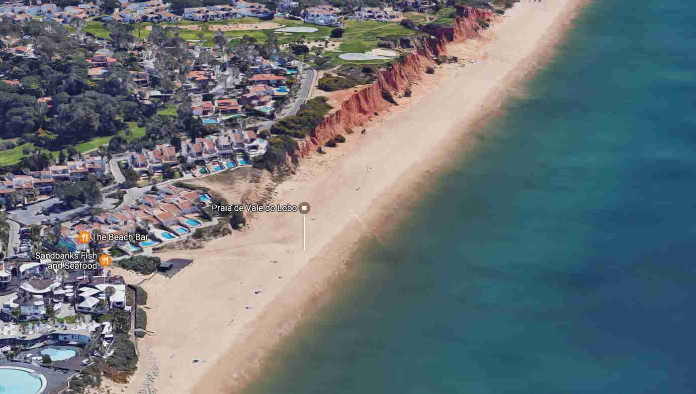 Playa de Vale do Lobo es una playa algarvense que está cerca del pueblo de Quarteira. Un elemento que nos encatará de esta playa, son los acantilados naturales que rodean la playa y que dan una gran sensacion de intimidad. En estos acantilados en las épocas frías del año, se refugian multiples aves marinas. quarteira1 El estado de natural de la playa la podriamos calificar de Semivirgen ya que aunque tiene algunos servicios básicos como algún chiringito o incluso en alguna zona encuentra muy bien conservada y alejandonos un poco de esa zona vamos a encontrar una playa virgen. En las cercanias de esta playa hay campos de golf que llegan hasta la misma arena en los acantilados y es muy llamativo el verde de los greens con el dorado de la arena. 1 La playa es muy ancha y extensa con una gran cantidad de arena así que no no vamos a tener problemas para poner la toalla incluso en las épocas más concurridas del verano. Me gustaria añadir que si estás buscando una playa en la que que desaparecer, has encontrado una que puede cumplir tus expectativas pues esta playa es enorme cientos y cientos de metros de playa para disfrutar del sol y de la arena. Playa de Vale do Lobo tiene una excelente arena dorada clara que no se pega mucho a la piel y es muy agradable.