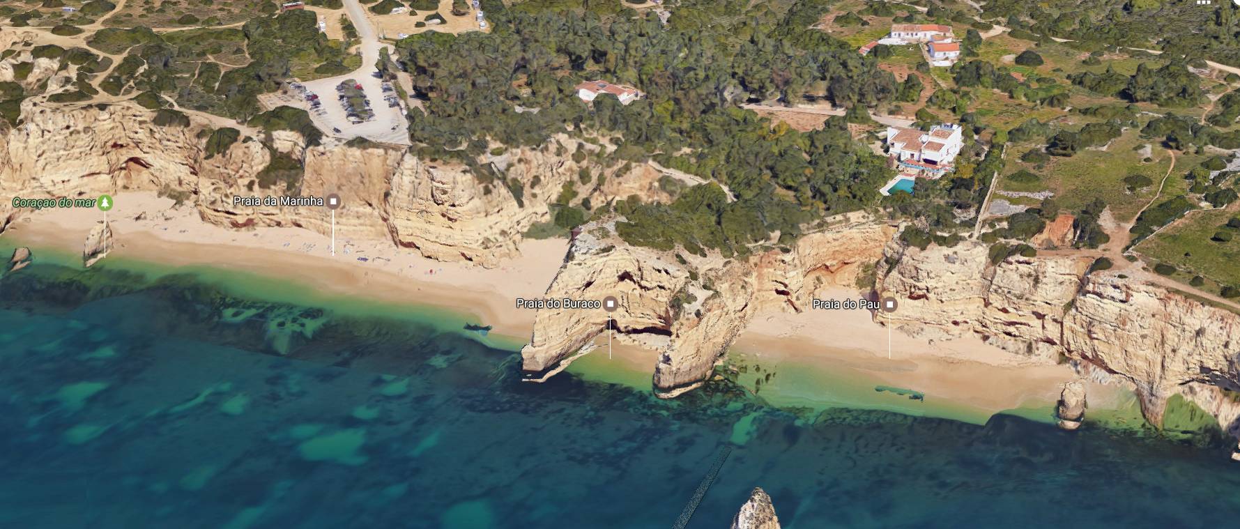 Playa Marinha es una playa algarvense que está cerca del pueblo de Porches. El Algarve en general tiene playas en espacios naturales muy virgenes que bien por su lejania a los destinos convencionales o por su dificil acceso hay poca accion humana y son lugares muy intimos y tranquilos y generalmente si hay es un pequeño bar, pero no hay duchas ni otros servicios, Playa Marinha es una de esas playas Virgenes que os encatará. El acceso a la playa no es sencillo y deberemos dejar el coche bastante alejado y darnos un buen paseo para llegar al mar. La ventaja de esto es que nos vamos a encontrar una playa muy tranquila casi sin nadie que nos moleste. La playa es bastante estrecha por lo que cuando sube la marea puede incluso llegar a desaparecer bajo las olas. Un elemento que nos encatará de esta playa, son los acantilados naturales que rodean la playa y que dan una gran sensacion de intimidad. En estos acantilados en las épocas frías del año, se refugian multiples aves marinas. Playa Marinha es una playa bastante pequeña, casi una cala por lo que en verano puede estar bastante saturada. Playa Marinha como la mayoría de las playas del algarve, es de arena pero tiene algunas partes en las que tiene rocas, si nos bañamos cerca de ellas debemos tener cuidado pues podria haber erizos de mar que si los tocamos sin querer nos podemos pinchar o podriamos chocar con ellas si hay corrientes o oleaje. Frente a Playa Marinha, encotramos algunas rocas que sobresalen del mar y que dan un precioso contraste al color turquesa del mar algarvense.